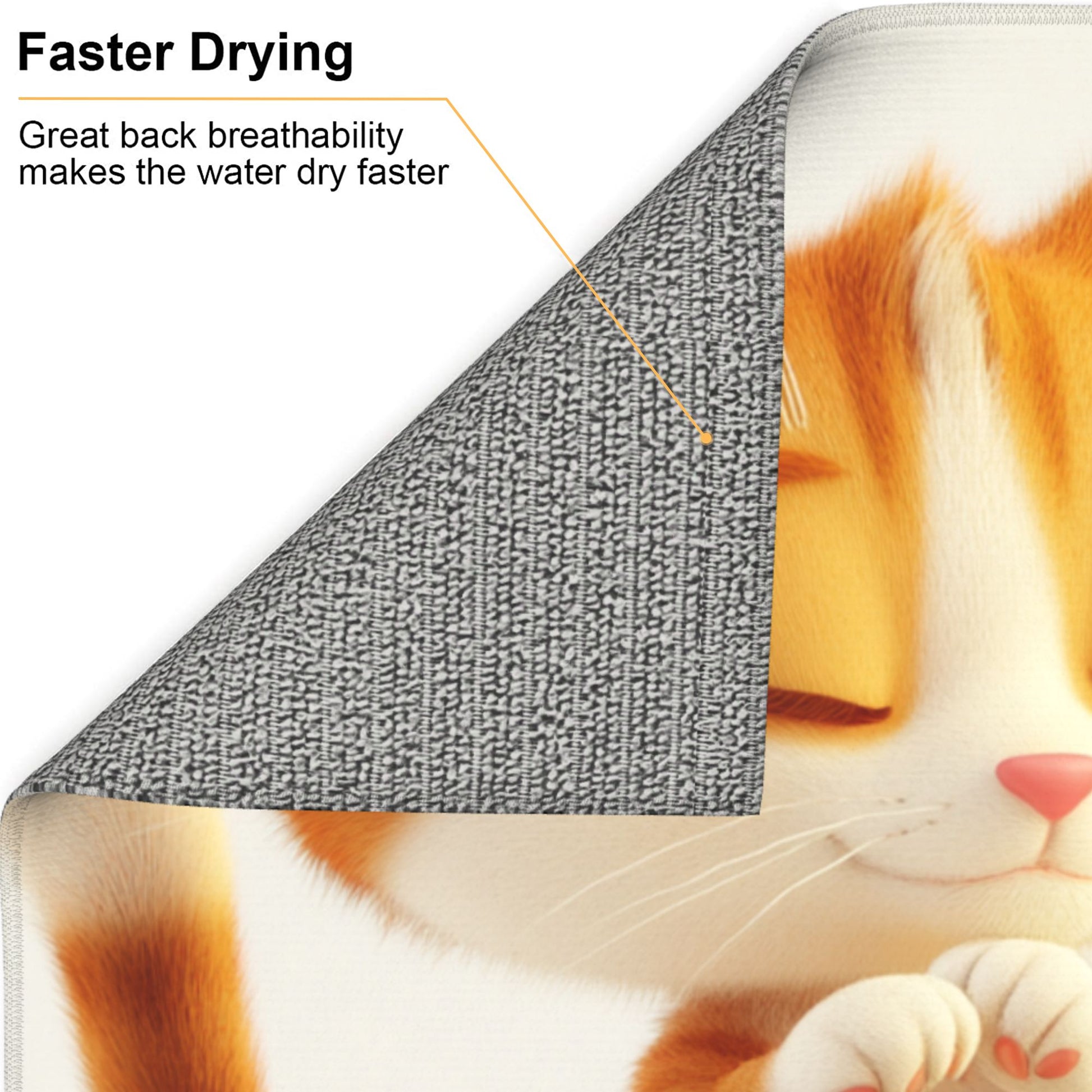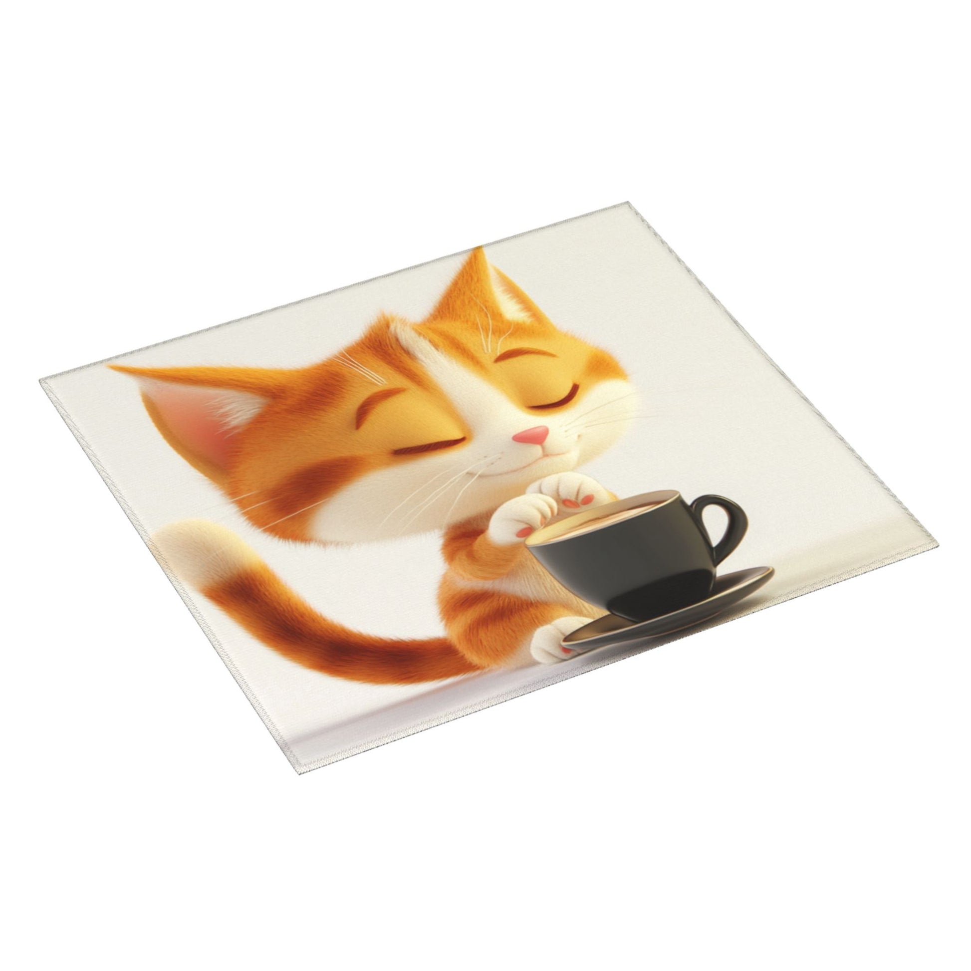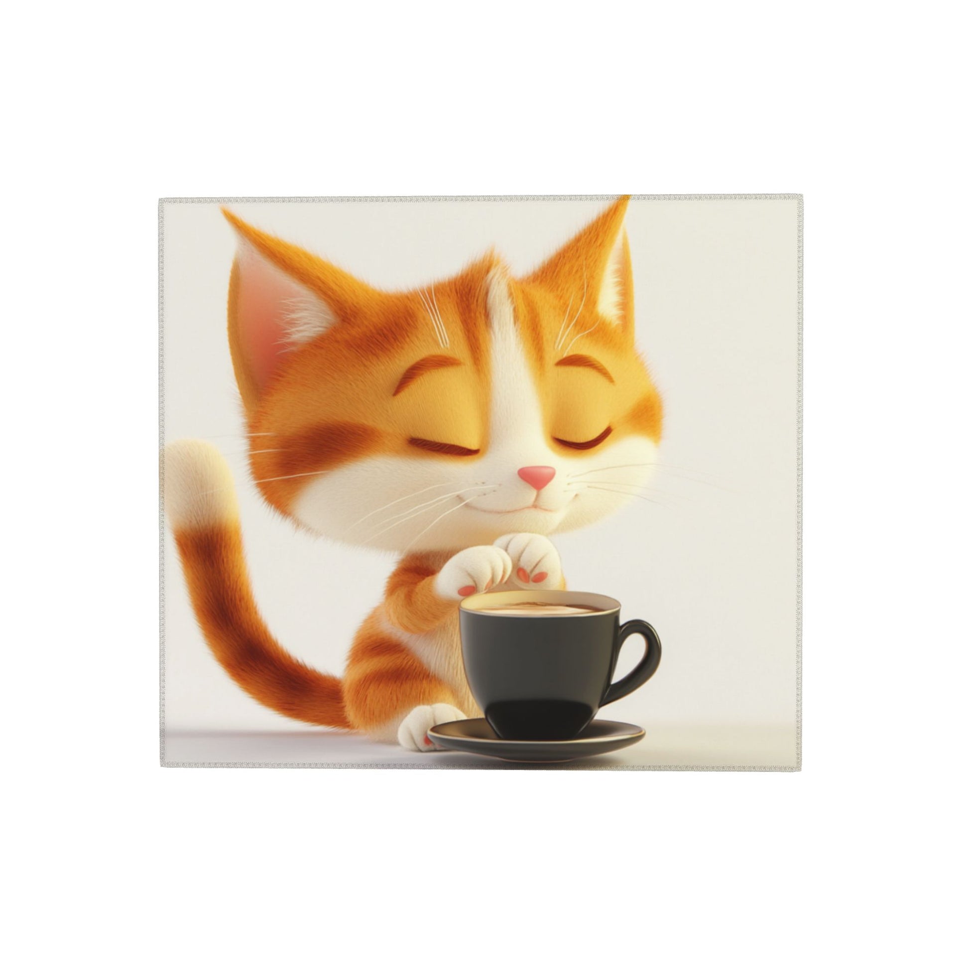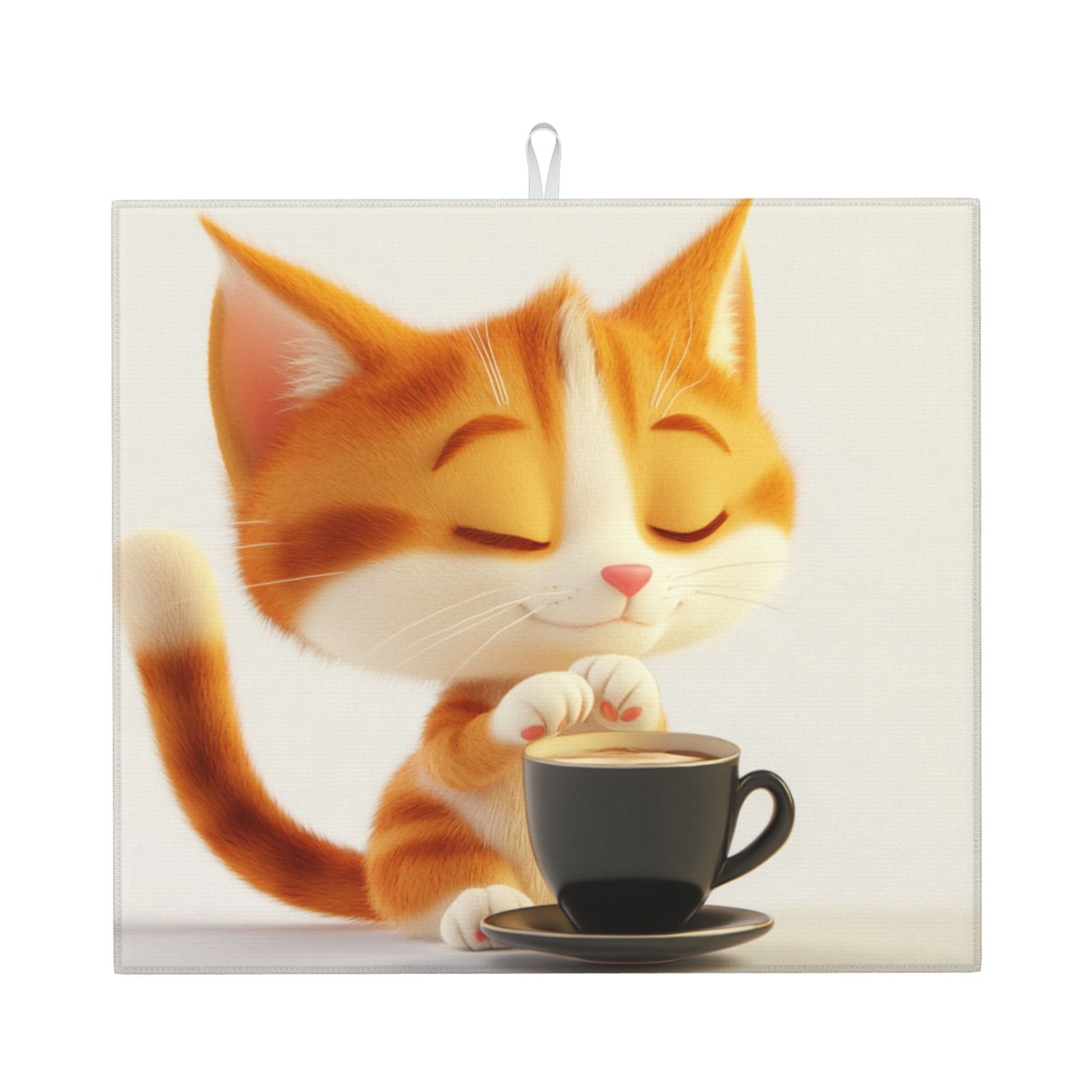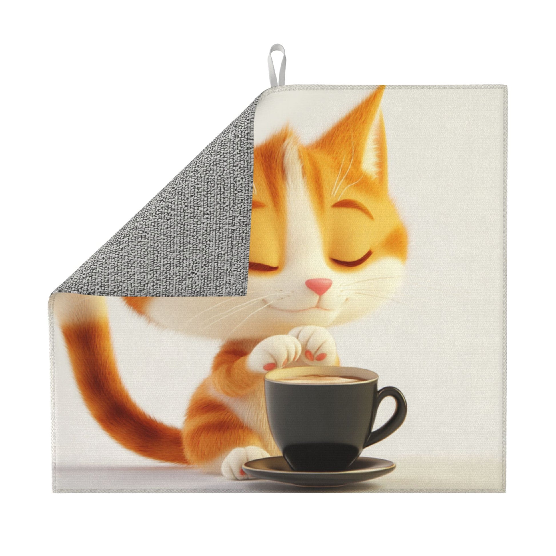 This adorable towel features a heart-melting illustration of a sleepy orange cat blissfully sitting beside a steaming coffee cup. With eyes gently closed and a content smile, this kitty exudes relaxation and charm, perfectly capturing a moment of feline-style “coffee break.” The minimal white background and warm tones enhance the cozy and cheerful aesthetic.