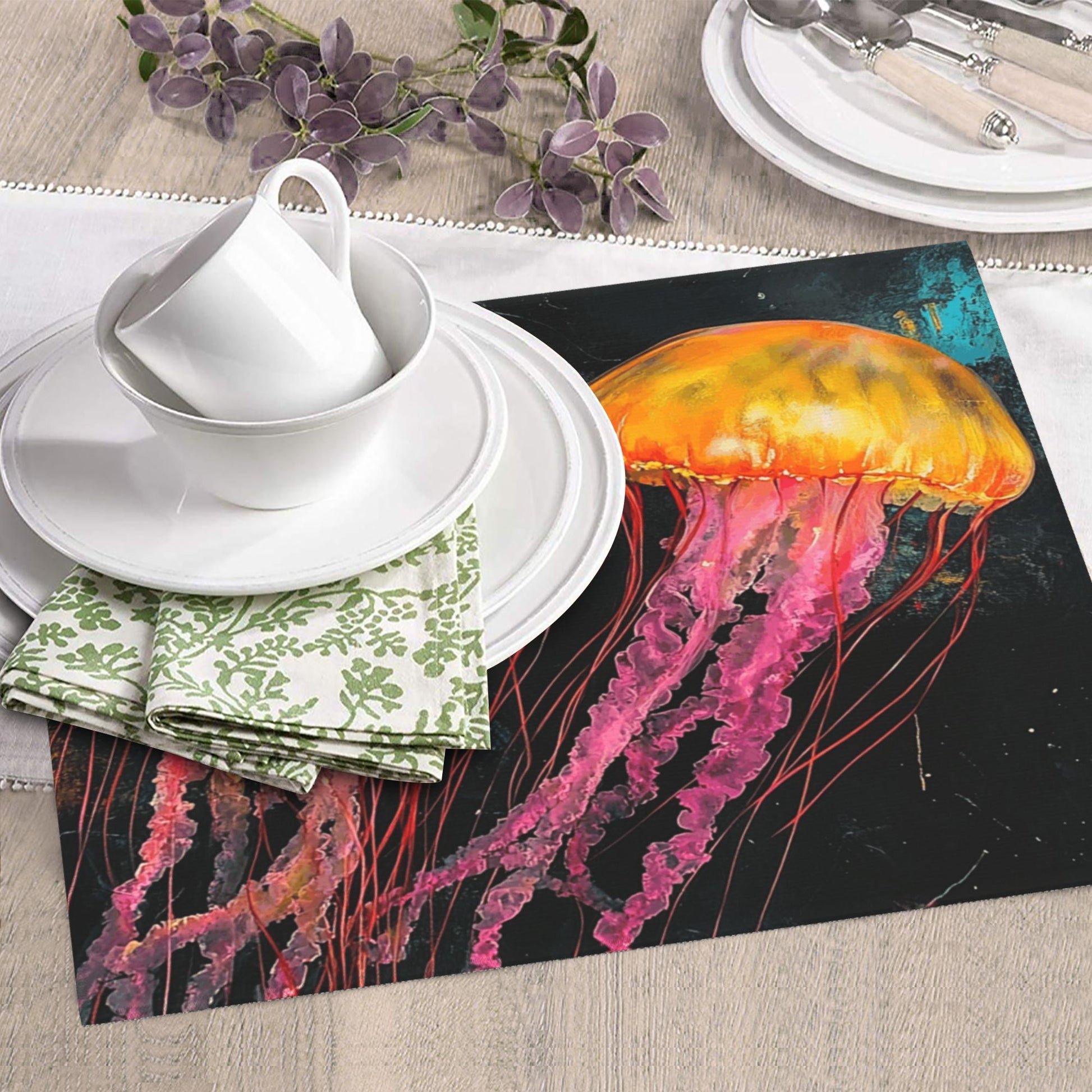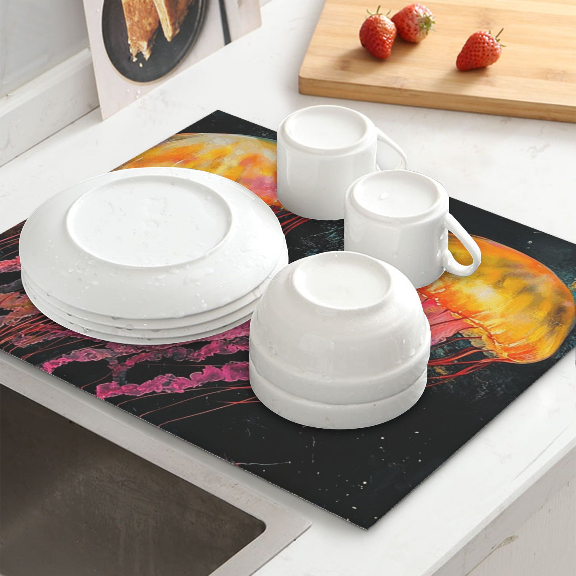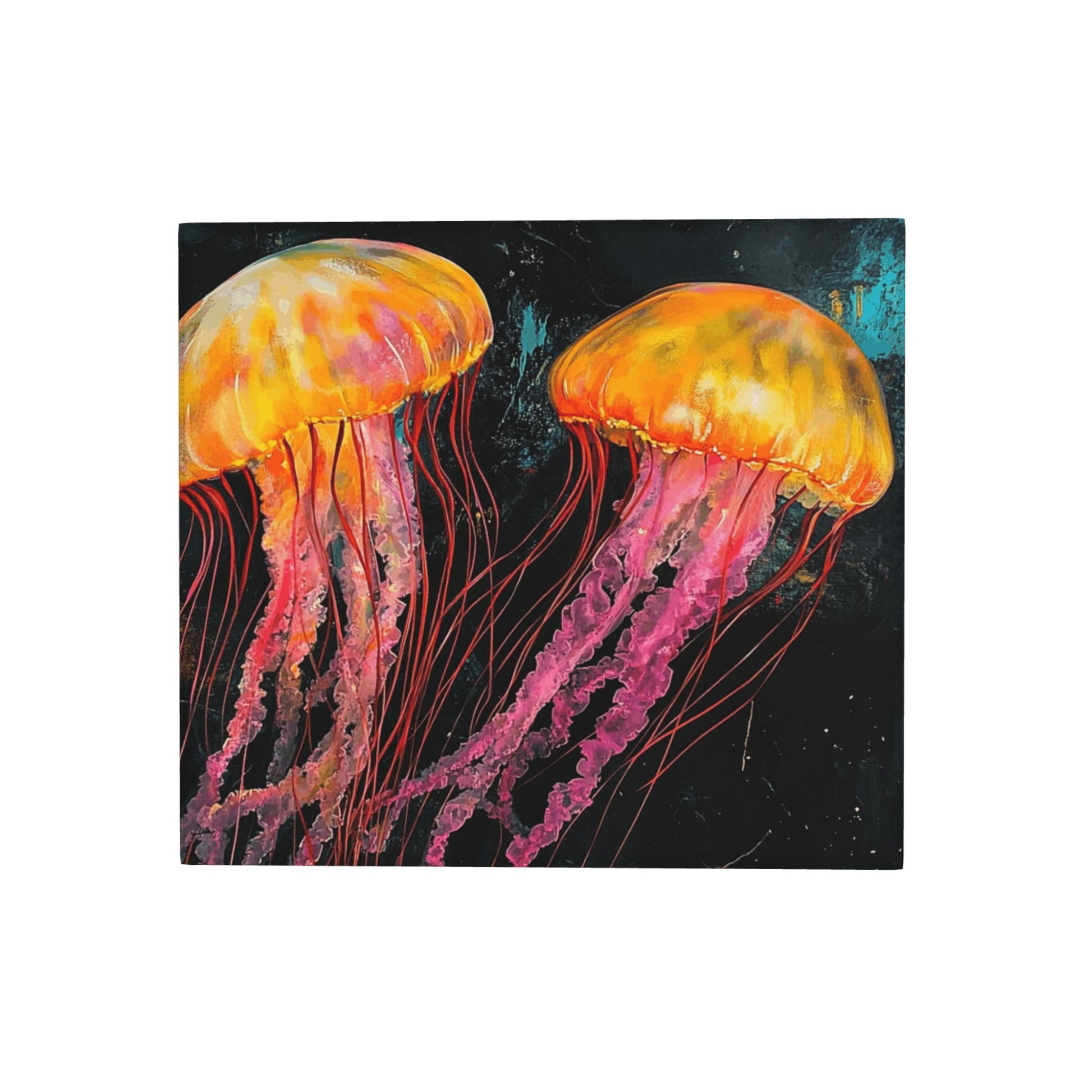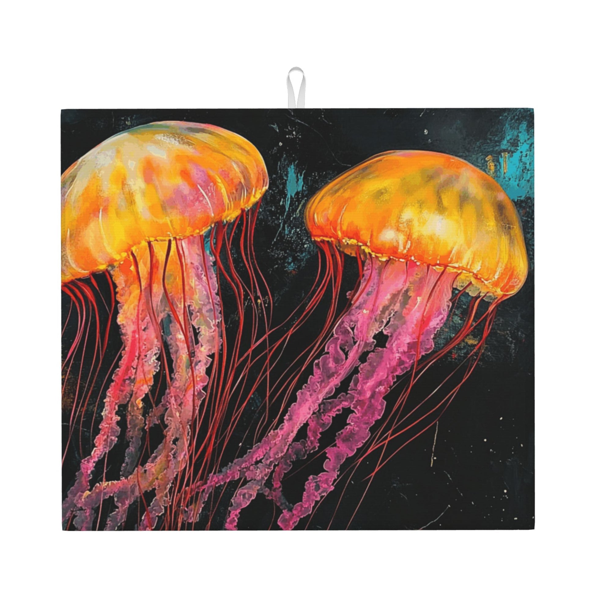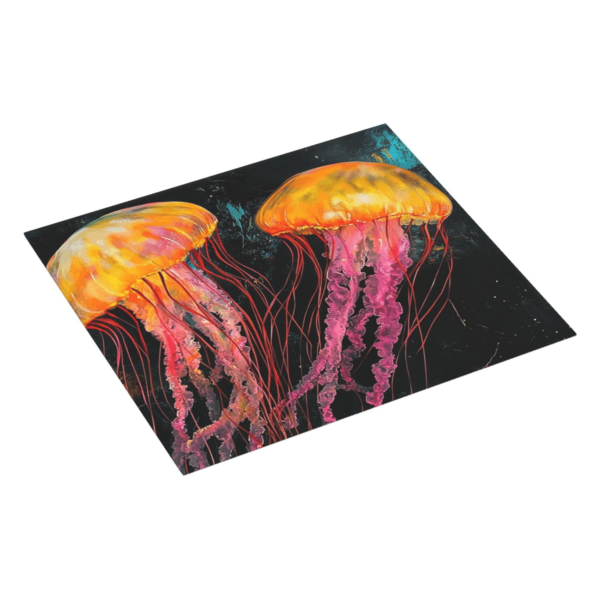 Dive into the depths of artistic expression with this vivid jellyfish-themed towel. Featuring two glowing jellyfish drifting in a dark, starry sea, the image radiates motion and marine magic. Their bell-shaped tops glow in fiery oranges and golds, while their pink and red tentacles trail like underwater flames—turning any kitchen or wall into a portal to the ocean’s mystery.